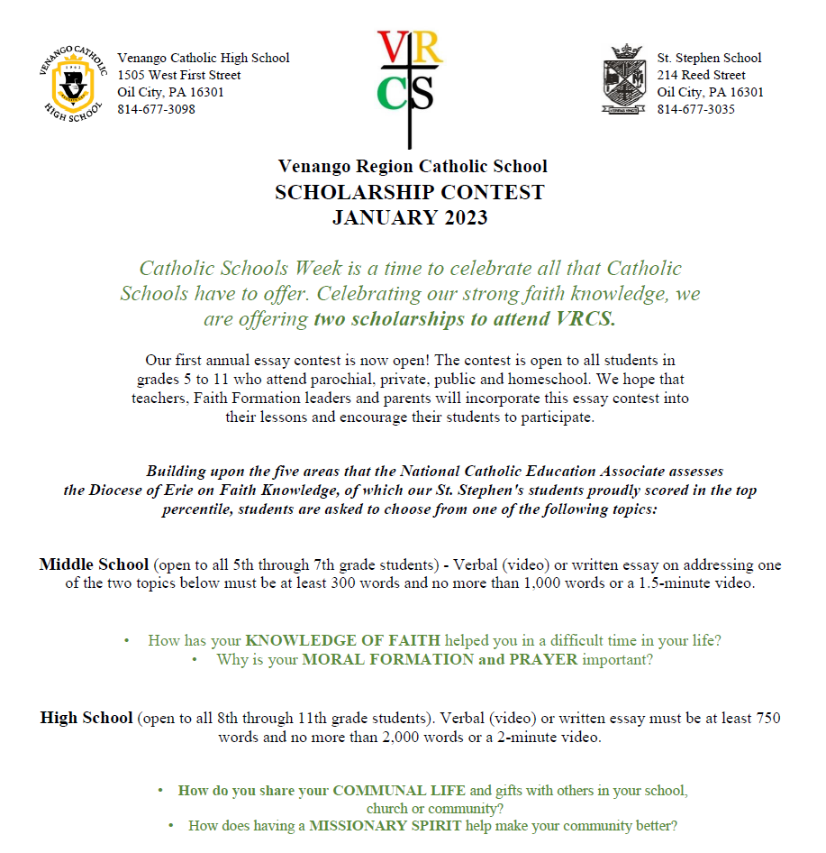Venango Region Catholic School (VRCS) is an association formed by the Diocese of Erie, St. Joseph Parish (formerly St. Stephen Parish) and St. Patrick Parish. The association operates a preschool-through 8th grade elementary school on the St. Stephen School Campus on Reed Street in Oil City, PA.